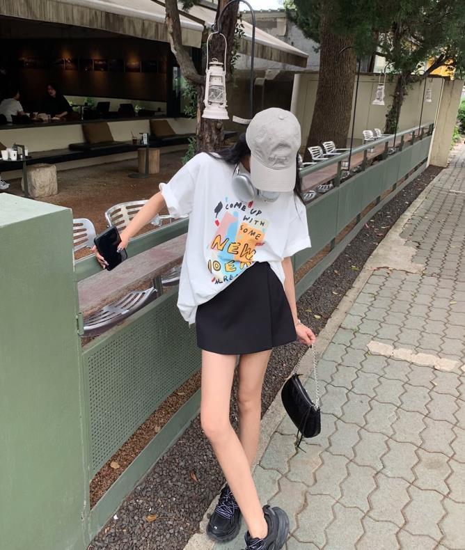 超級減齡的塗鴉白色t恤,寬鬆的版型,對於身材的包容性也是超讚的,選擇黑色半裙搭配,再加上一雙黑色運動鞋,與裙子、包包的顏色都進行了呼應,整個造型的協調性就更加棒了。