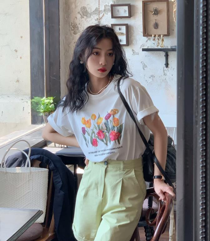 可別小瞧了t恤這麼一件基礎款單品,不管你想要打造什麼風格都是可以的,想要將t恤穿出溫柔優雅風?那麼你首先要選對一件合適的t恤纔行。鬱金香印花的t恤,給人一種很浪漫的氣息,寬度適中的版型,遮肉顯瘦,和簡單的純色短褲、裙子搭配就可以了。