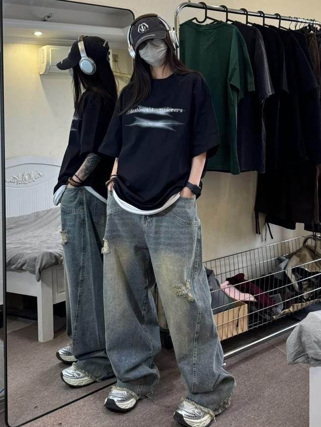 今年真的很流行大一號的t恤,經典黑色t,寬鬆的版型,不管你是什麼身材都能輕鬆駕馭,裏面可以疊穿一件白色背心,稍微爲整個造型增加一些層次。搭配一條寬鬆的牛仔拖地褲,復古美式少年感真的愛了。