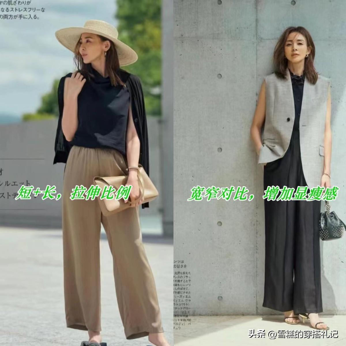個子比較矮的女人,在穿衣搭配上更需要多關注一下色塊的比例感,比如這種短款的上衣,配上長褲和長裙,在色調對比之下,形成了上短下長的身材比例,輕而易舉的拉伸身形,顯高顯瘦翻倍。