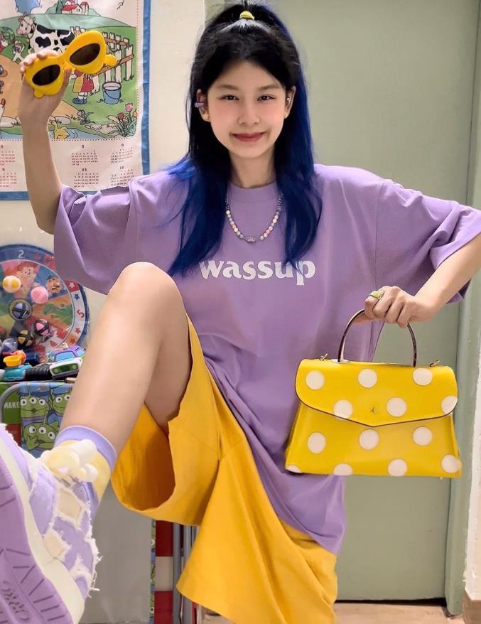 將鹹蛋黃和丁香紫色巧妙結合在一起,整體的配色看了就讓人產生愉悅感,這種穿搭配色無疑能釋放出大量的多巴胺,讓人心情愉快。這麼時尚又洋氣的組合,最能吸引衆人目光了。