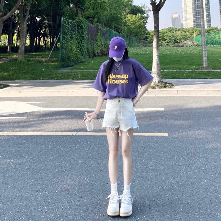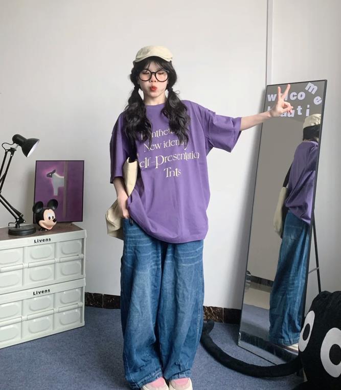 給大家分享一套我很喜歡的紫色穿搭,帶字母印花的丁香紫t恤,大大的版型,下裝再搭配一條寬鬆的牛仔褲,不得不說的是這樣的搭配休閒又不失日常。看起來就很舒服自在,而且,這個顏色的t恤能讓你膚色看起來很白皙。