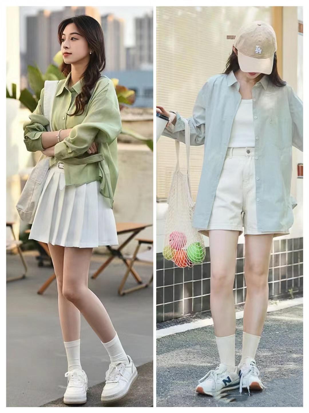 如果擔心淺綠色太亮會顯的膚色暗沉,就選擇更加柔和的豆綠色。豆綠色的襯衫、或者開衫、T恤,既溫柔又顯白,還會讓我們的穿搭更加時髦醒目,搭配白色百褶裙、板鞋也很減齡。