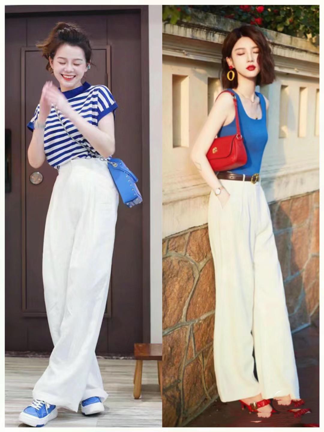想要日常休閒一些,或者酷颯惹眼一點,還可以選擇寶藍色的條紋T恤、以及寶藍色的小背心。用寬鬆的落肩T恤配白色高腰褲、清爽又大方。