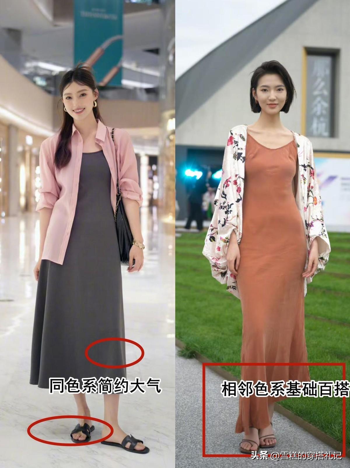 想要給穿搭增加一些貴氣感,那麼建議大家儘量多嘗試途中的有一些厚度的真絲緞面長裙,用厚實的質感來壓低真絲過於廉價的氣質,可以給你帶來更加高貴典雅的搭配風格,而且這種料子比較有垂墜感,對於身形的延伸效果也非常出衆,兼具顯高又顯瘦的屬性。