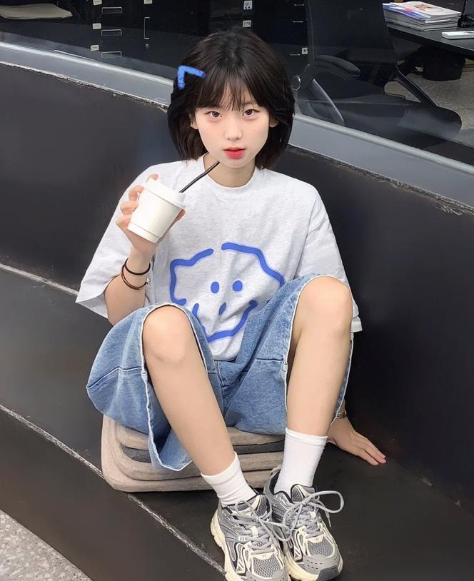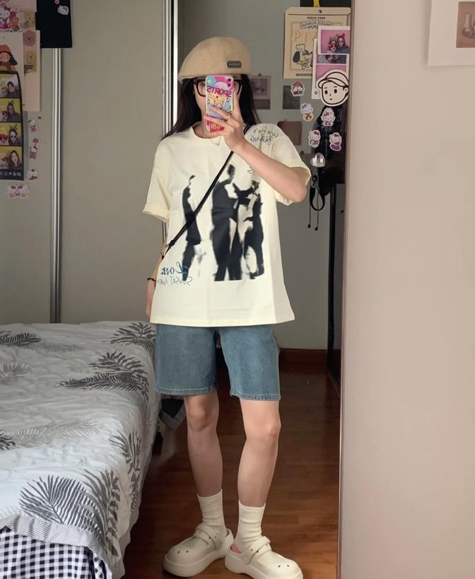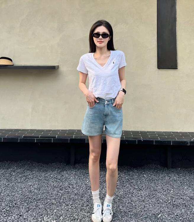 簡潔的牛仔短褲搭配輕盈透氣的短袖t恤,這大概是運動女孩出街的標配吧,這麼穿可以讓人感受到清爽自在。寬鬆的牛仔短褲,這個版型太適合大腿粗的身材了,穿起來顯瘦又襯托出纖細修長的大長腿。