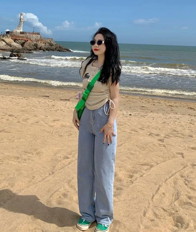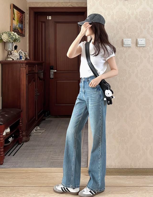 這一條淺藍色牛仔闊腿褲,穿起來可顯瘦啦,相信很多腿粗的身材都會很喜歡吧?配上一件短款t恤,整體的造型看起來就很出彩,對於身材嬌小的姐妹來說,這樣的搭配不僅顯高挑,還顯腿長。