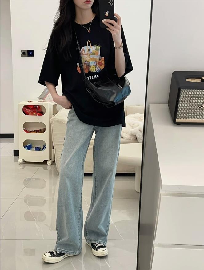 試問,誰能夠抵擋得住這一身穿搭呢?黑色t恤配牛仔闊腿褲,很經典時髦的組合,水洗的牛仔款式,舒適養眼,肚子上有肉肉的姐妹,穿上這麼一件t恤簡直太合適了,既舒適又時尚。