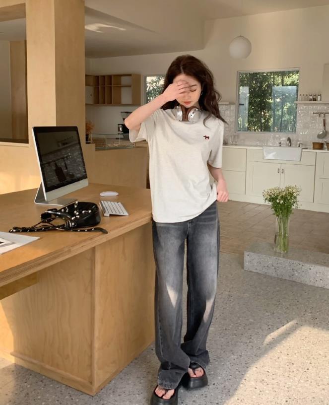 很適合夏日的韓式簡約穿搭,清爽與慵懶感都快溢出屏幕了,這可是最適合夏日的組合呢,一件白色t恤配牛仔闊腿褲,同樣是寬鬆的版型,讓人倍感舒適,悠閒又自在。