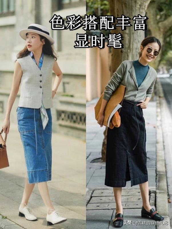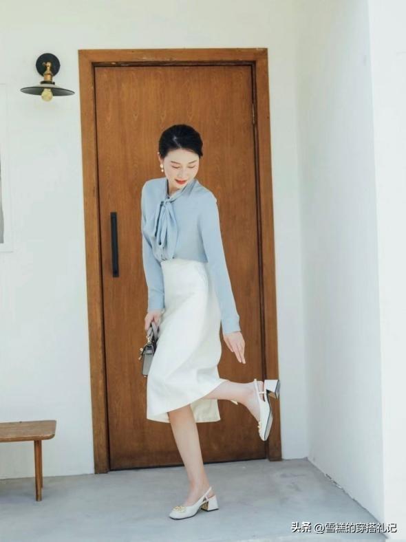 二、“膝下裙+低跟鞋”的搭配入選,要能契合自身且起到修飾效果