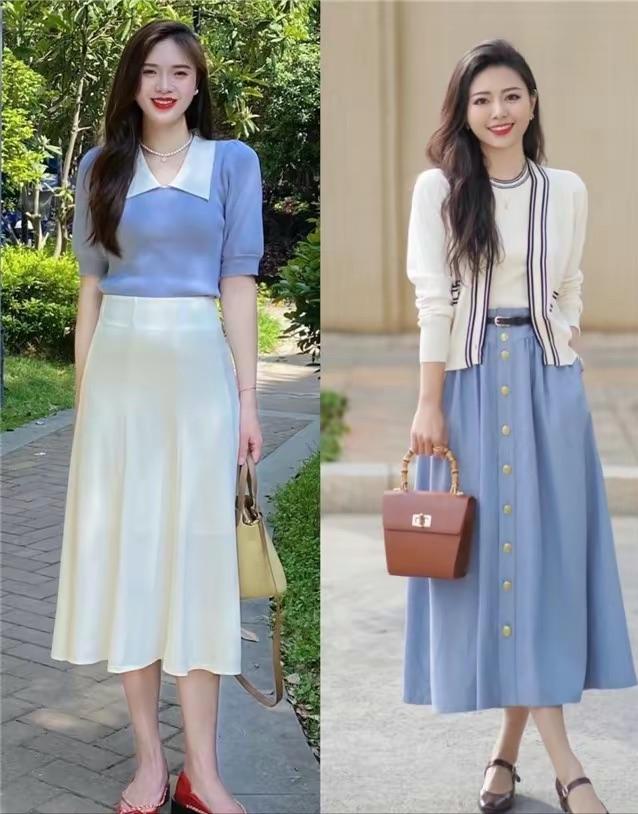 腰部自然收緊,或者帶有修身效果的奶奶衫,都可以配版型寬鬆的半身裙來穿着。裙襬寬鬆的半身裙,舒適又具備了包容性,露出小腿和腳踝位置,都更加顯瘦。
