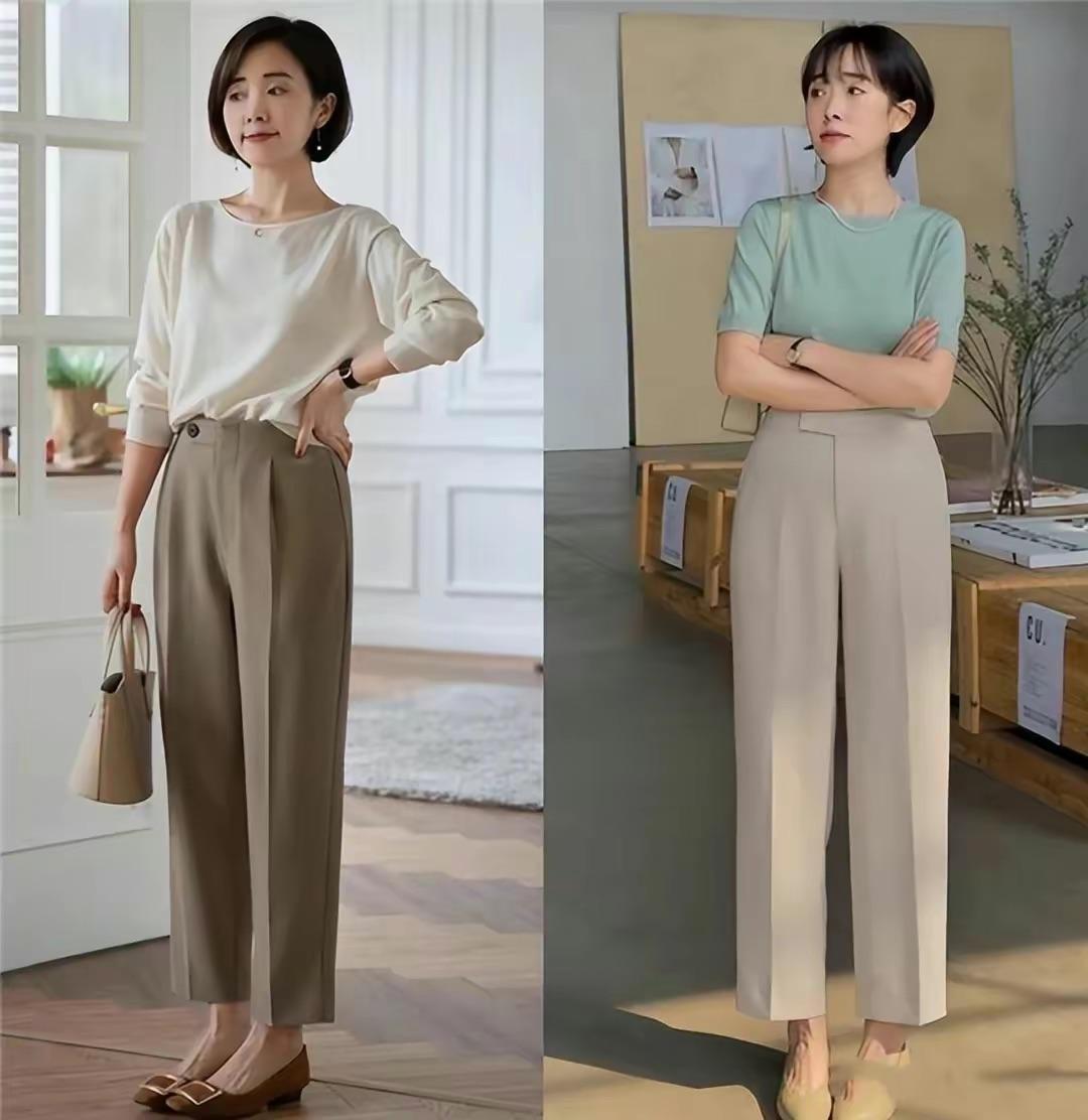 我們選擇九分西裝褲的時候,可以搭配相對柔和的淺色系,顯得氣質更加溫柔。高腰的九分西裝褲,儘量配比較垂順的面料,更加容易打理。