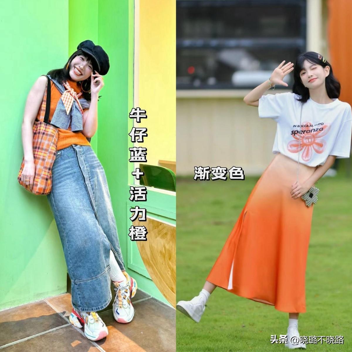 若活力橙處於下裝的狀態,便可以直接搭配白T恤,裙腰的位置用白色進行漸變,從而達到一個過渡的效果,在視覺上更顯高。