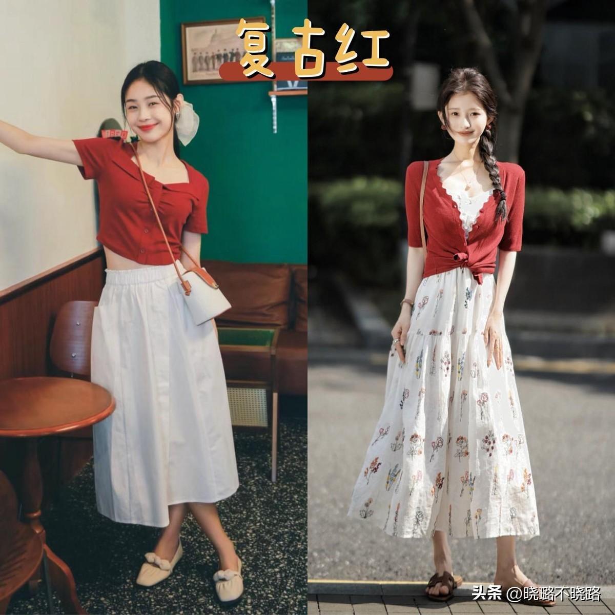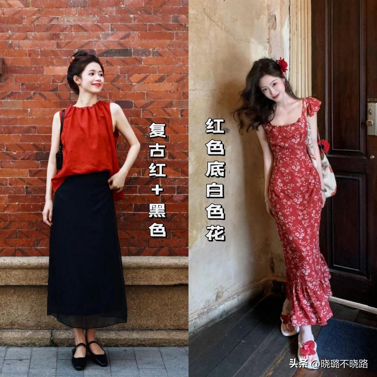 復古紅既可用於無袖襯衣當中,搭配黑色a字長裙,營造出幹練利落的一面;也可以用於連衣裙的底色,加入白色碎花圖案,一明一暗,對比感更強。
