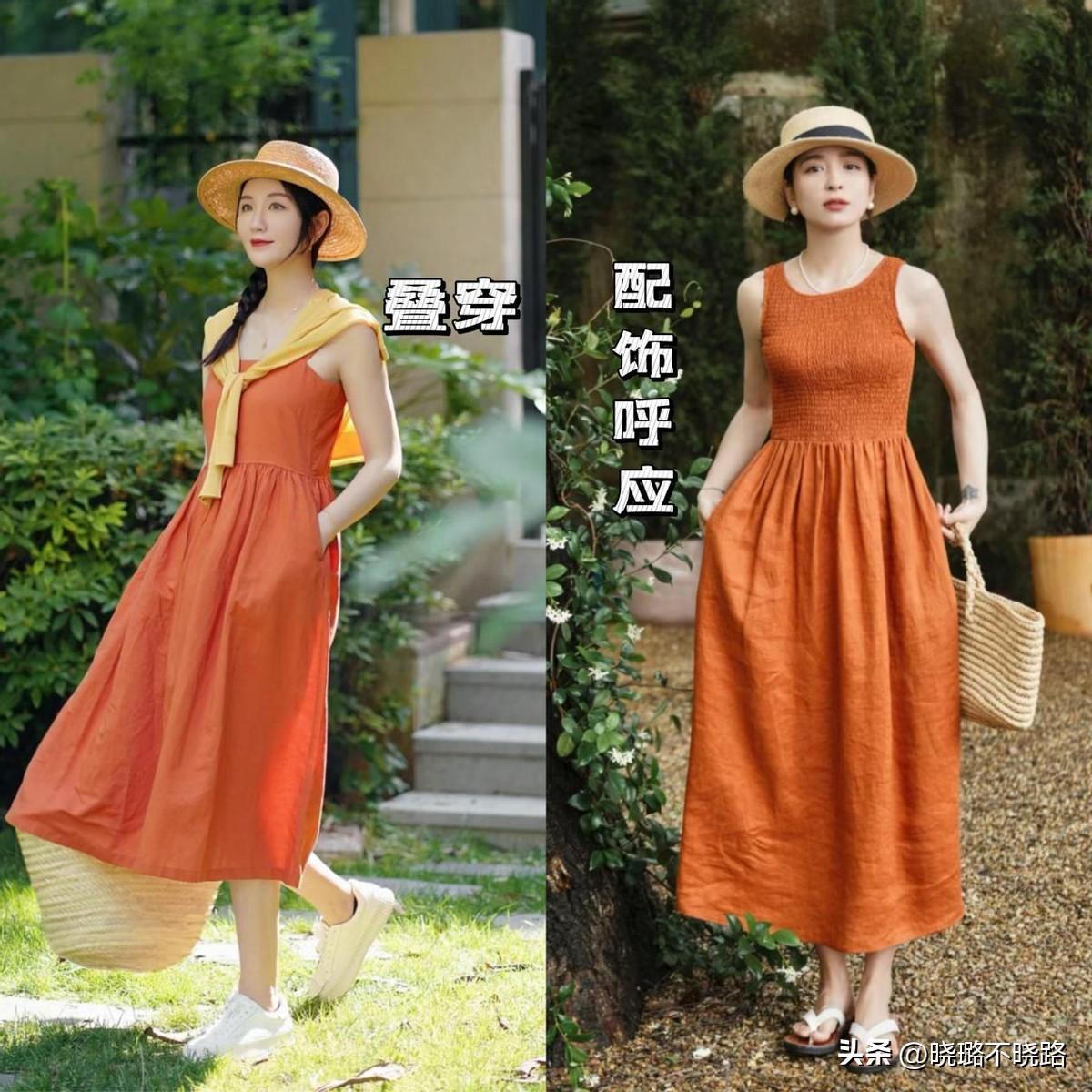 比如,活力橙連衣裙可以疊加同色系的黃色披肩,去豐富造型;或者,也可以直接單穿,佩戴草編帽和草編包,增強放鬆隨性風氣息。