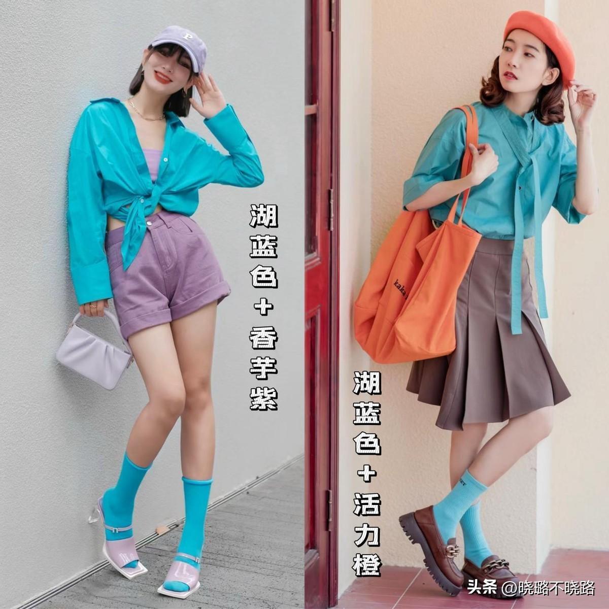 具體搭配湖藍色的時候,可以用到撞色的方式,比如湖藍色+紫色調,就具備和諧之美,無論是深紫色還是淺紫色,跟湖藍色的匹配度都很高,顯白又顯嫩。