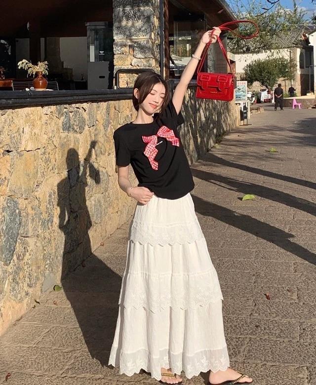 好喜歡這套裝扮啊,帶有蝴蝶結設計的短袖t恤,搭配潔白的半身蛋糕長裙,韓風十足,而且還十分顯溫柔呢,最重要的是黑白配色,很耐看也不出錯,短款的t恤+長款裙子,優化身材比例絕絕子。