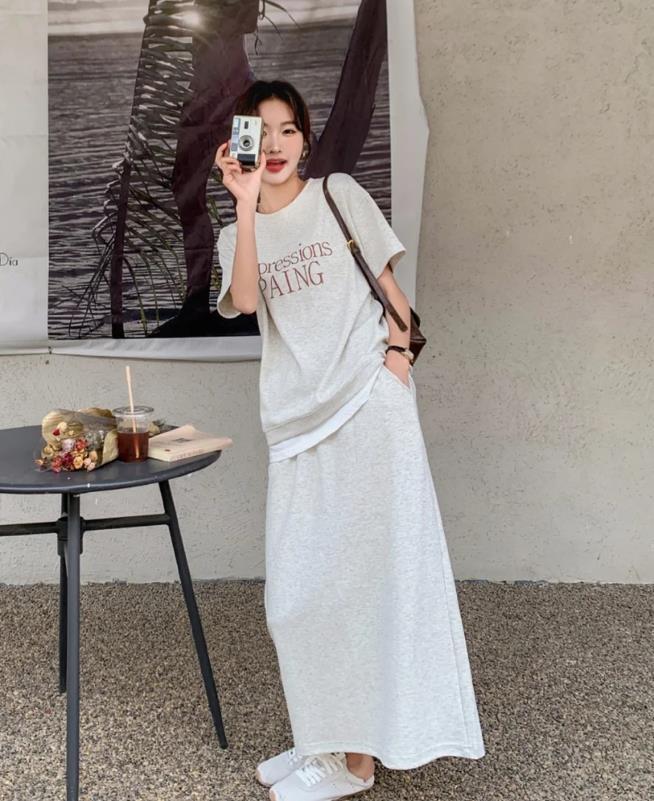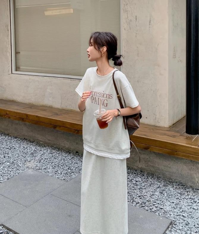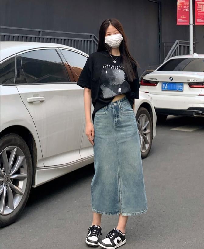 真的很喜歡這一身穿搭啊,短款t恤與直筒半身長裙相配,也太完美了吧?寬鬆的裙身,一點都不挑身材穿,藏肉的同時,更遮掩起身上的缺點。利用上短下長的搭配方式,小個子穿了也顯高挑。