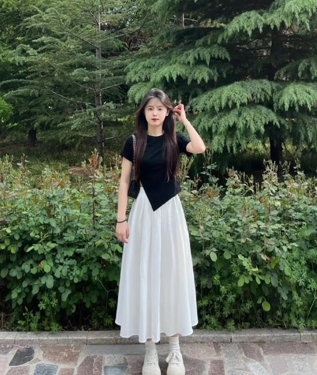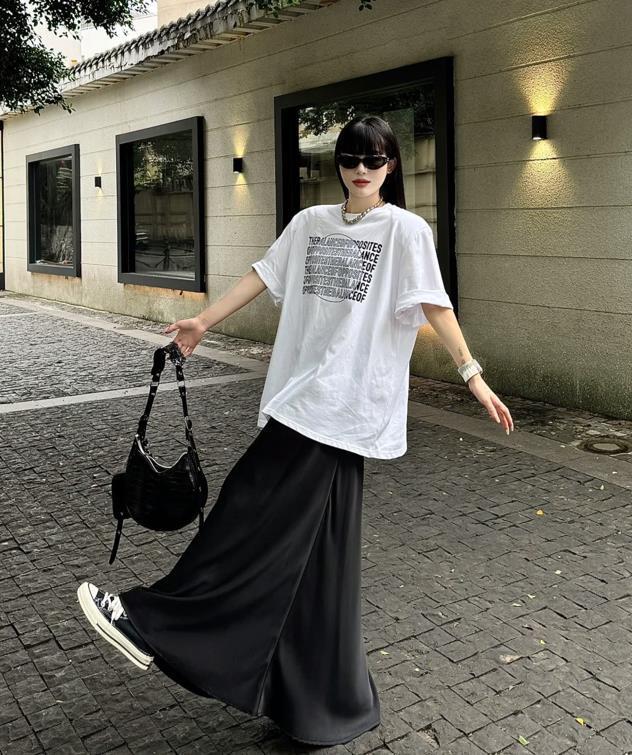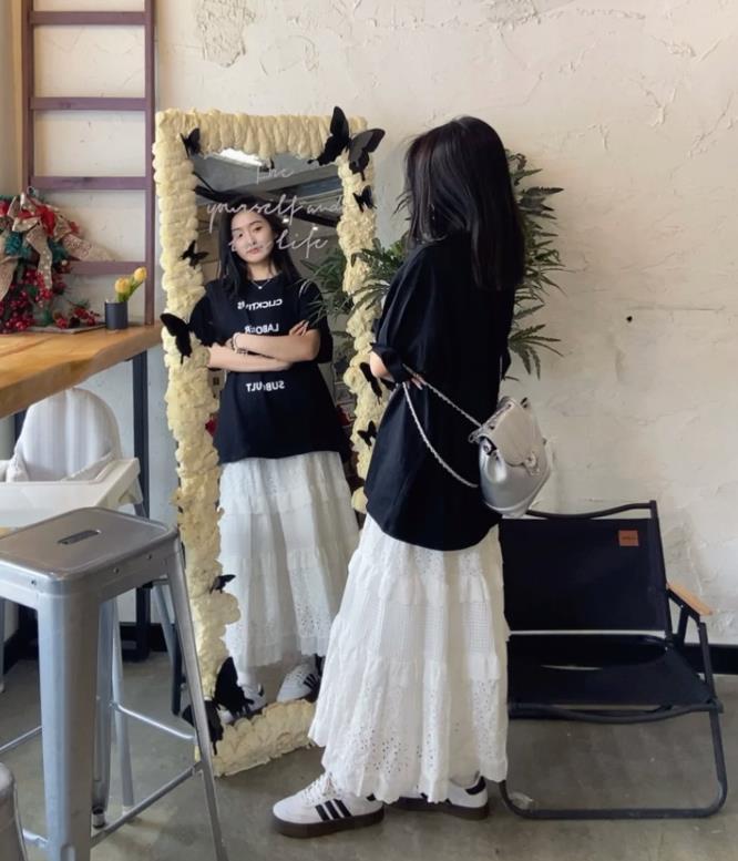 黑色t恤與白色半身蛋糕裙的組合,黑白交織,永不過時的一對cp,喜歡上下都是寬鬆的版型,鬆弛感十足,誰懂?至於配什麼鞋子好看,我覺得一雙運動鞋就可以搞定你整個造型。
