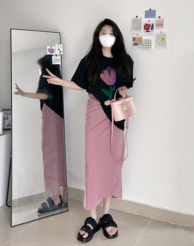 這一件黑色鬱金香印花圖案的短袖t恤,看起來就很漂亮呢,而且這個顏色也非常百搭,不管你要怎麼去搭配都很時髦。T恤的版型也是寬鬆的,很適合炎熱的夏季,下身搭配的粉色半身裙,質感很不錯,細膩又帶着閃光的效果。不管是正式場合,還是休閒場合都能輕鬆駕馭。