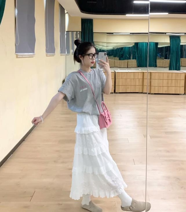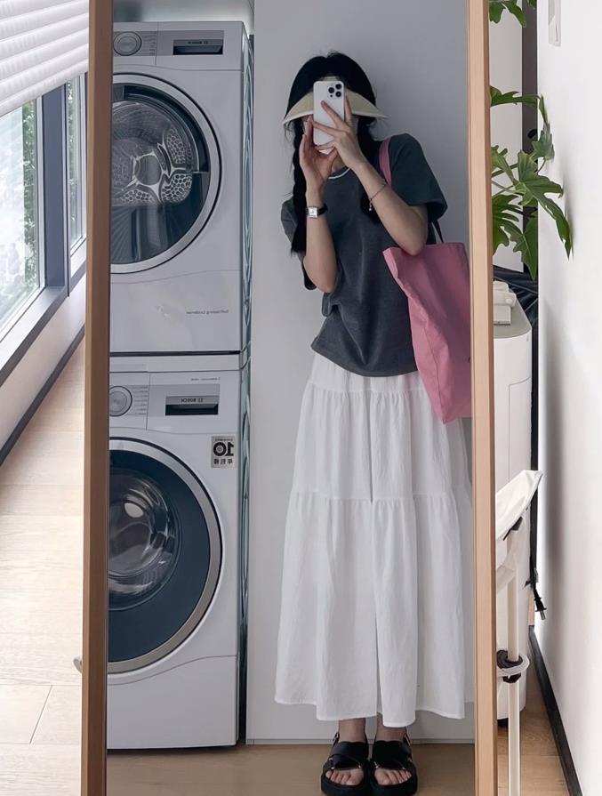被這一件灰色t恤與白色半身蛋糕裙吸引住了,整個造型的風格偏韓系甜美範,t恤的下襬稍微將一點塞進裙子裏面,不僅提高腰線比例,還巧妙拉長腿部線條。