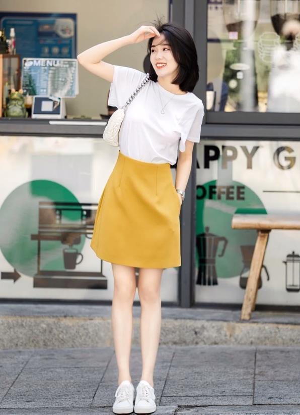 純白色的t恤,搭配亮色半裙,這樣的搭配實在是太適合夏天了,簡約又不失明快,小個子女生記得要將t恤塞進裙子裏面,這樣才能很好提高腰線比例,從而拉長腿部線條。週末出門逛街,或者是度假遊玩,這麼一身穿搭都能讓你賺足回頭率。