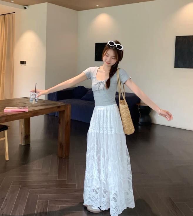 第一眼就被這件u領短款上衣吸引住了,穿上身也太顯瘦了,視覺上感覺自己真的變瘦了很多,搭配白色高腰a字半身長裙,蕾絲面料的設計,增添了滿滿的韓範和少女感,美極了。