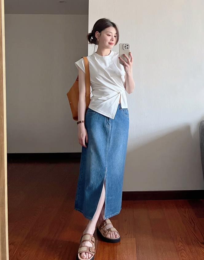 選擇一條開叉牛仔半身裙相配,很好讓整個穿搭多了幾分青春活力,腳下踩着一雙涼鞋,出門逛街、度假休閒都是妥妥的。