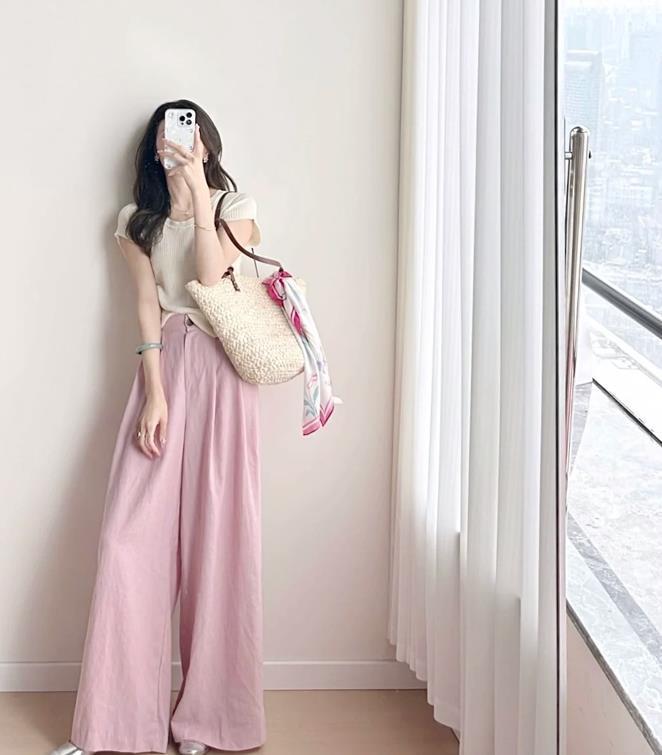 在夏天裏,穿上這麼一條亞麻材質的褲子,實在是太棒了,融入了甜美的粉色,減齡不說,還帶着滿滿的少女範。褲子的舒適度也是極其讚的,不僅顯高挑,還能很好拉長腿部線條,寬鬆的褲型,有效遮掩腿上的肉肉。