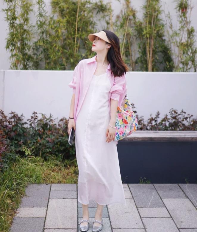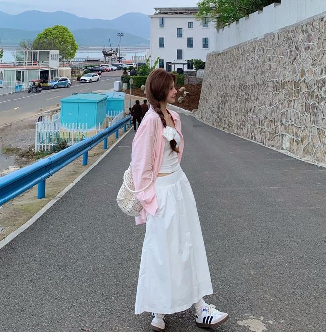 粉襯衫搭配白裙子,這樣的配色組合實在是太少女了,甜到了骨子裏,直接把襯衫當做防曬衫來穿,裏面配了件白色背心,要將裏面的內搭露出來,這樣才更清爽涼快,下身搭配的白色半身長裙,與內搭進行了呼應,和諧又高級。