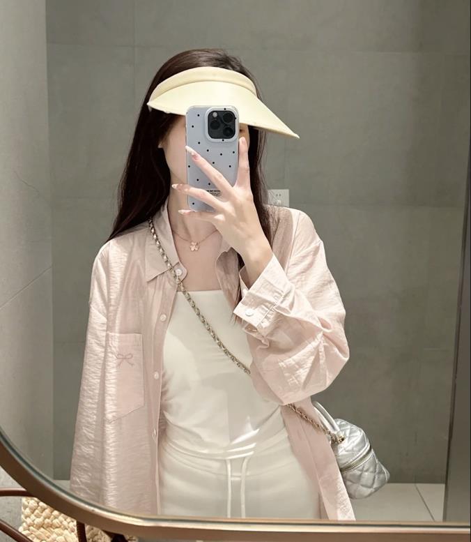 很顯輕盈透氣的櫻花粉襯衫,即使是在悶熱的夏季穿起來,也沒有一點問題,搭配細膩光滑的吊帶小白裙,整個造型洋溢着溫柔和氣質。