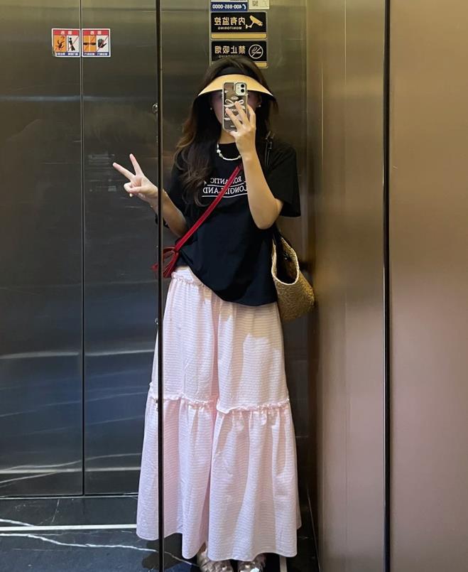 在炎熱的夏季,就算是一件普通的t恤,也可以帶給你想要的時髦與氛圍感,黑色t恤搭配粉色半身裙,完全不會顯得單調,反而是給人一種很清新的範。無論是日常上班,還是外出遊玩,這樣的穿搭都可以展現出你自身的美感。