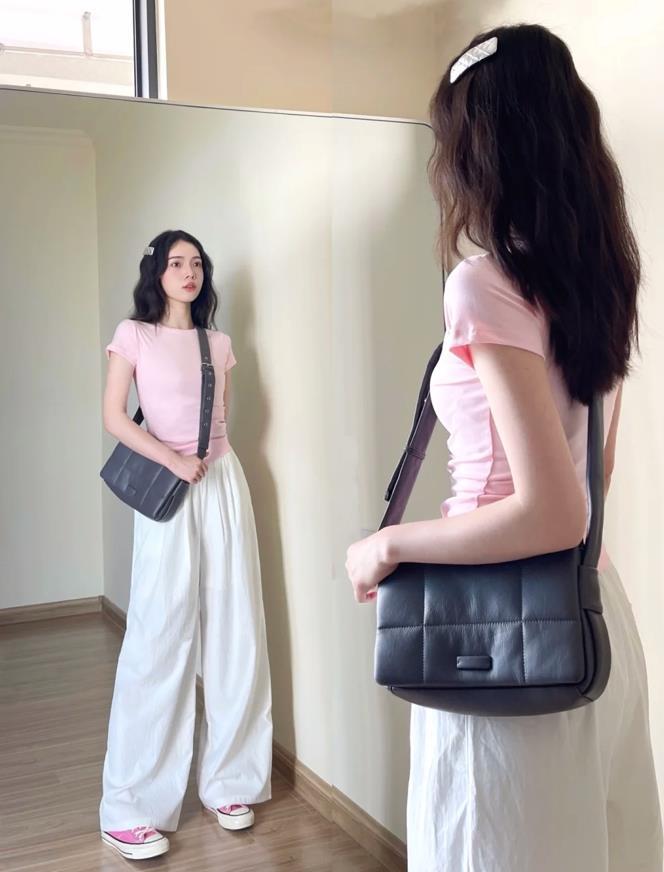 今年似乎很流行這種正肩短袖t恤,與粉色工裝褲的搭配,不僅顯得韓系風十足,還多了幾分火辣feel,這樣的穿搭簡直太戳我心了,在炎熱的夏季,這樣的穿搭清爽好看,又時髦出衆。