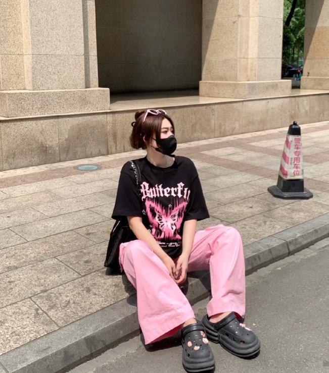 這一件甜辣風格的t恤,看起來就很不錯,搭配粉色長褲,簡直是出街最酷的穿搭了,褲子的面料舒適度是極其讚的,對於微胖的身材,這麼一件t恤也非常合適,在配色上,黑粉的組合簡直美炸了。