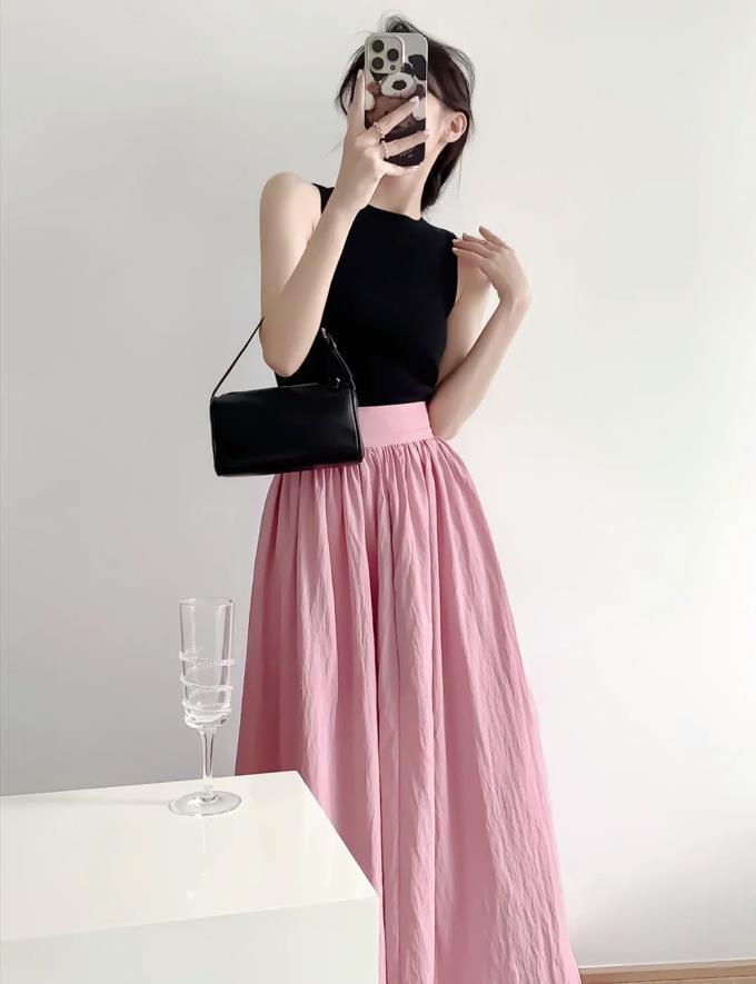 上窄下寬的比例穿法,真的可以將身材修飾得很完美,長度和版型都恰到好處的黑色背心,再配上一條粉色半身長裙,這種風格也太好看了,簡約卻不失時尚,出門可以吸引無數的讚美目光。