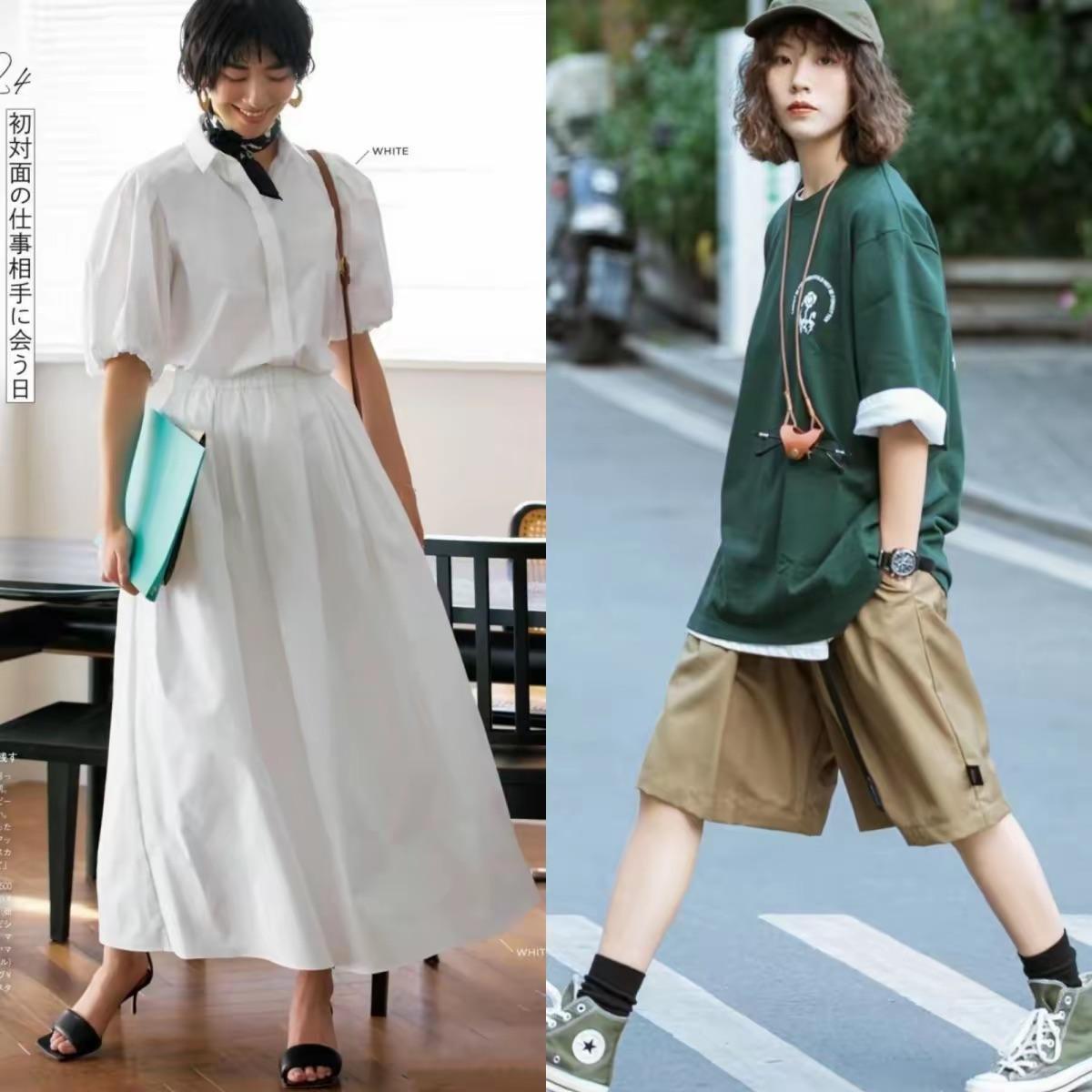 比如寬鬆的白襯衫、或者寬鬆的T恤,大量感的半身裙、寬鬆的短褲都可以用來塑造鬆弛感。尤其是寬鬆白襯衫+大量感的半身裙,同色系的組合高級醒目,頗有日雜風的隨性。