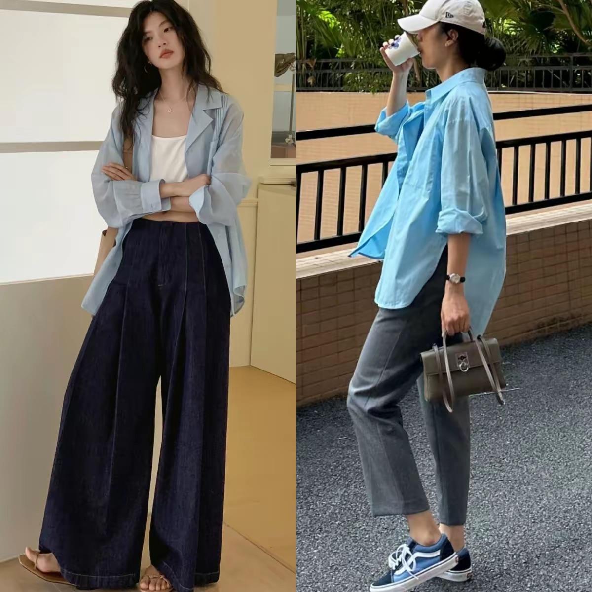 輕薄的襯衫,可以配修身的吊帶背心、或者垮肩背心來穿着。選擇輕薄襯衫的時候,儘量搭配淺色系。比如淺藍色襯衫,自帶降溫屬性、讓夏日穿搭格外涼爽。