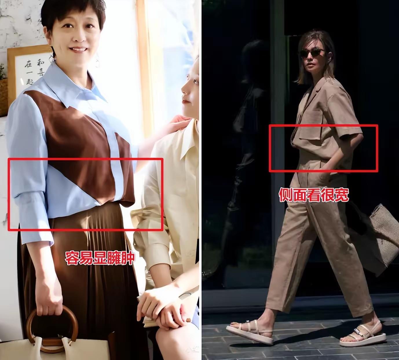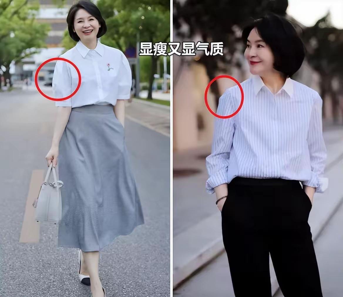 五六十歲的女人,似乎再也沒有蔥白一樣纖細的手臂了。麒麟臂、拜拜肉,最常見不過了。這時候不建議大家選擇寬鬆的泡泡袖服裝。