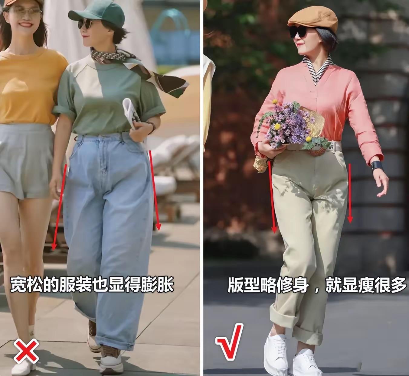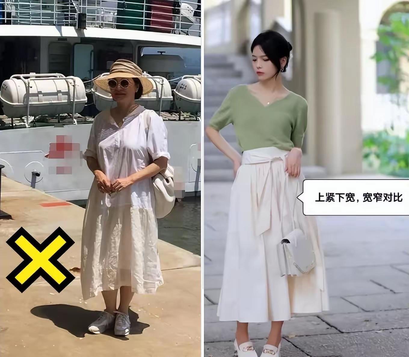 五六十歲的女人,在夏季穿衣的時候、儘量避免上松下松的搭配。就是上裝和下裝同樣是寬鬆的版型,就很容易拉寬橫向的比例,顯得體型厚重。