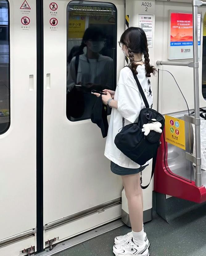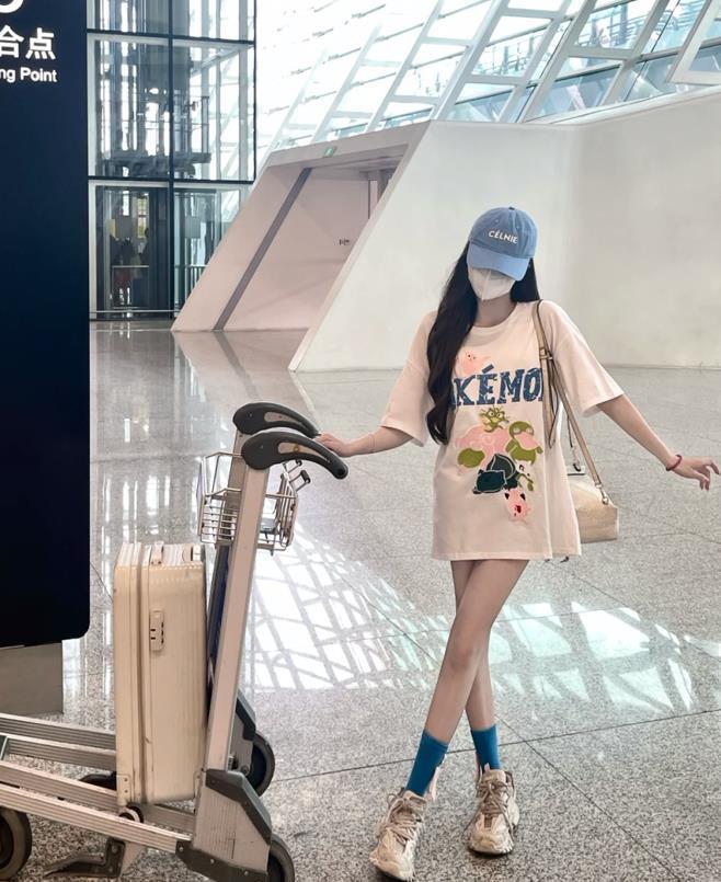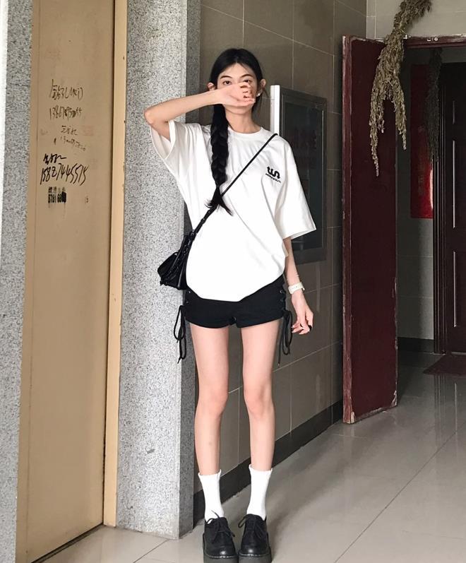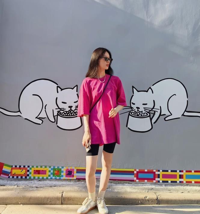 這種下身玩“失蹤”的穿法實在是太適合小個子女生了,白色印花長款t恤,小個子女生直接穿就行了,在下身配一條短褲,就這麼露出雙腿肌膚,不僅拉長腿部線條,還在視覺上增加高挑感。