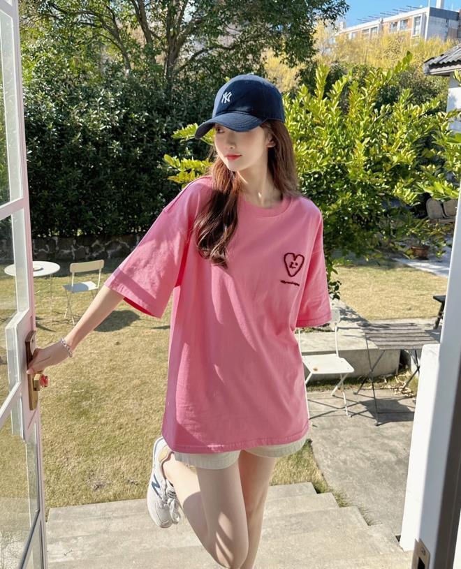 夏日甜美必選的一款桃粉色長款t恤,不僅減齡還很顯白氣質,寬鬆的版型襯托下,是真的非常藏肉顯瘦。搭配白色短褲,輕鬆就打造出元氣感,t恤的版型很寬鬆,穿起來帶着幾分慵懶和休閒的調調,玩下裝失蹤法最是顯腿長了。
