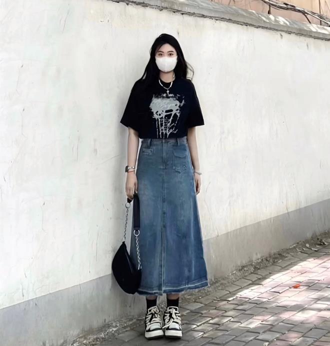 很顯溫柔氣質的鬆弛感穿搭,喜歡這種風格裝扮的姐妹們就學起來吧,黑色短袖t恤,版型還挺正的,t恤是純棉材質,透氣性和舒適度都是極佳的,下面搭配高腰牛仔半身長裙,直筒的裙身,最藏肉顯瘦了,自帶慵懶感。