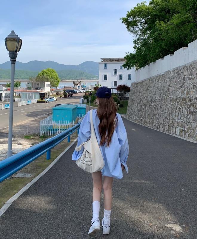 春夏季節,是真的很適合穿藍襯衫啊,不僅僅是藍色襯衫,其他藍色單品,也能帶給你清新幹淨的氣息。寬鬆長款藍襯衫,小個子直接玩下身失蹤法就行了,下裝不管是配短褲,還是短裙,都是非常不錯的。
