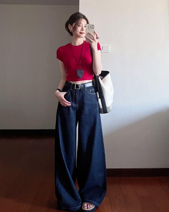 說實話,上短下長的組合,實在是太適合小個子女生了,修身紅色短袖t恤,正肩的設計,把肩膀線條修飾得極佳。微微露腰的設計,不僅展現出小性感,還提高腰線比例,搭配高腰牛仔闊腿長褲,這腿怎麼看都有一米八的既視感。