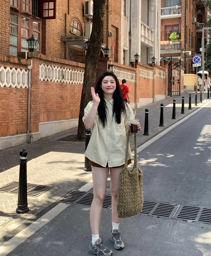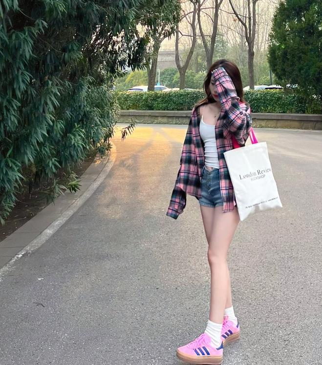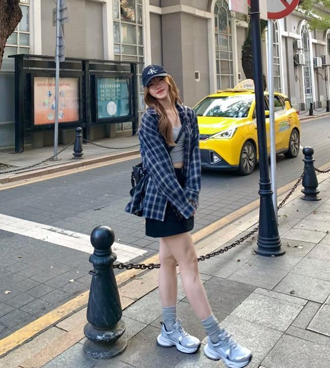 我是真的很喜歡襯衫+短裙這種組合,感覺這樣穿起來就有種韓國女主的既視感,網格透氣的運動鞋,穿起來非常舒適,格子元素的襯衫,還帶着幾分復古氣息,小個子女生很適合這樣穿。