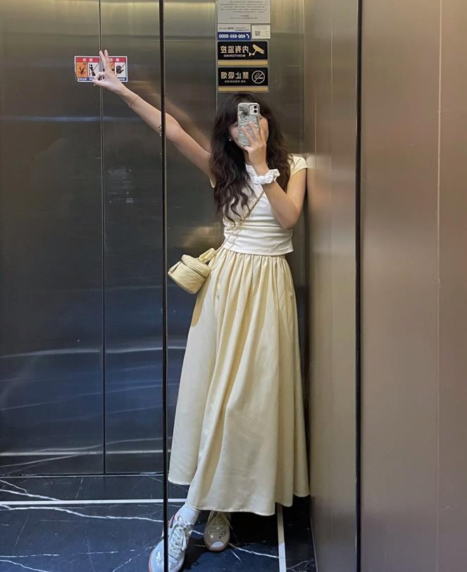 真的很喜歡這一套穿搭,奶酪色的裙子配色,也太溫柔了吧?傘字形狀的裙身,很好修飾身材比例,遮胯的同時,還顯瘦藏肉。搭配白色短款t恤,有些修身的版型,比較適合小個子骨架小的身材。