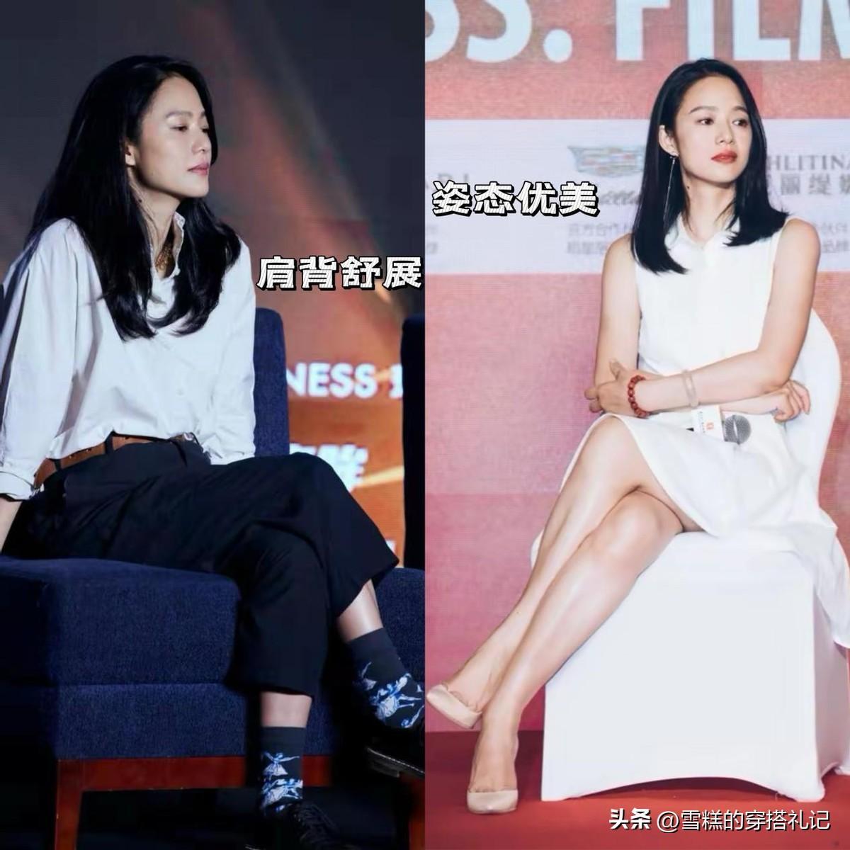 仔細觀察周韻的氣質來源,就不難發現她的一舉一動是非常優雅端莊的,尤其是坐姿特別鬆弛,從不會刻意端着,肩頸位置會特別舒展,向後擴更加挺拔。