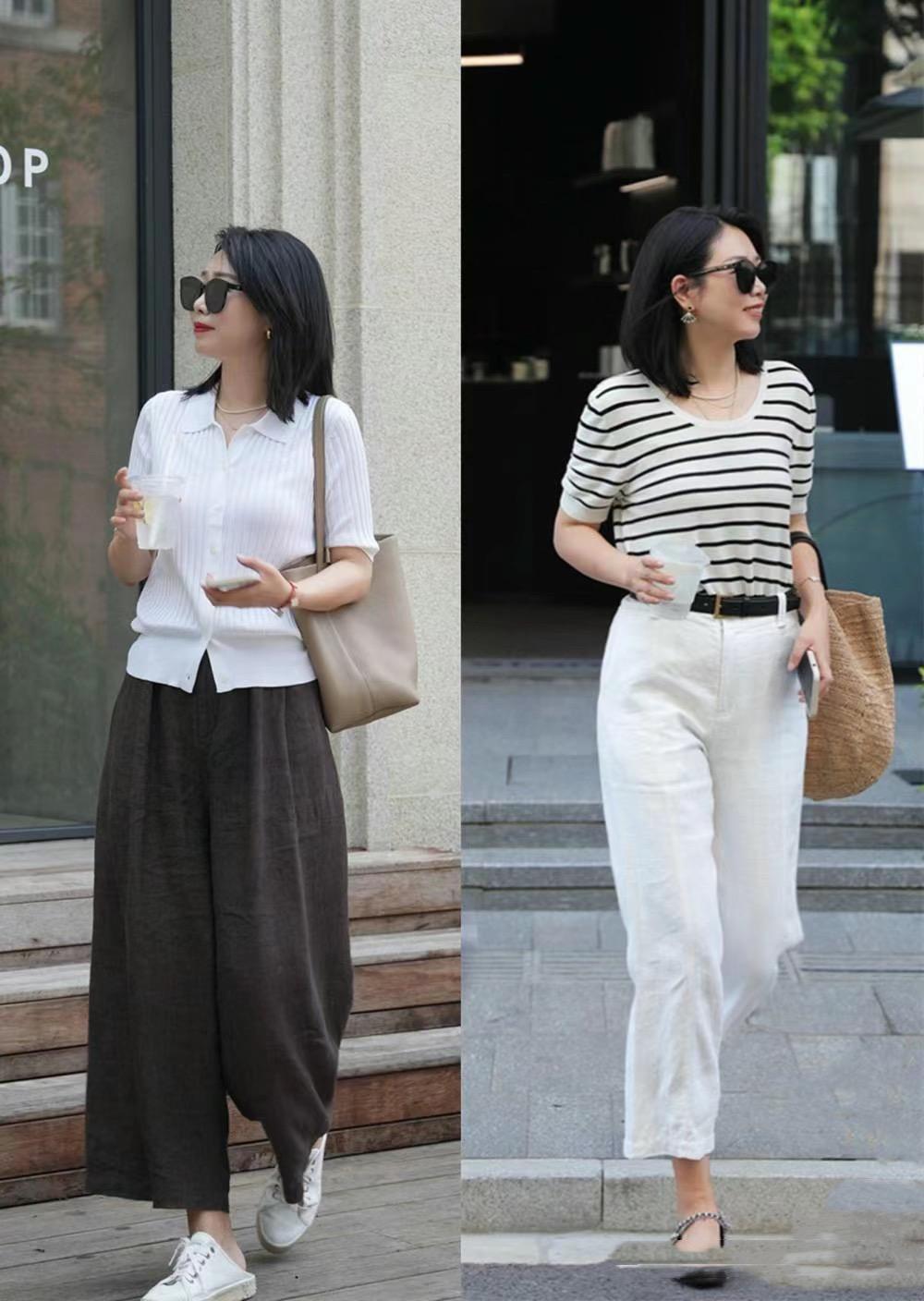 比如白色襯衫+白色闊腿褲,這樣的一身白色造型,就是以色彩降溫的最好方式。春夏季節的白色襯衫,可以選擇雪紡、真絲、桑蠶絲、香雲紗等面料,穿起來舒適又清涼。