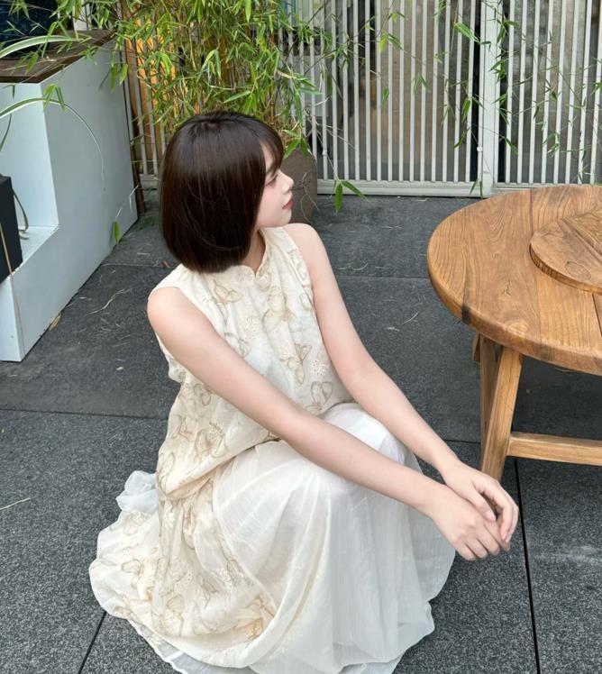短髮女孩也可以很溫柔的啊,今年不是很流行新中式風穿搭麼?不如你給自己入手一條新中式的裙子吧,像這麼一款顏色淡雅的新中式連衣裙,和利落甜美的短髮相配,也太美了。