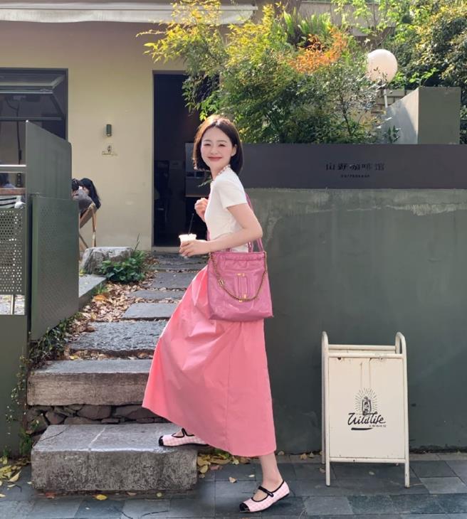 白粉的配色看起來太溫柔啊,對不對?乾淨簡潔的白色t恤,是有些修身的版型,正肩設計,很適合小個子,骨架小的身材。搭配一條粉色半身長裙,腳下一雙同色的單鞋,甜美範十足。